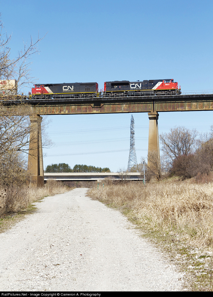 CN 8937 along with repainted BCOL 4618 lead 107 over the Humber River.