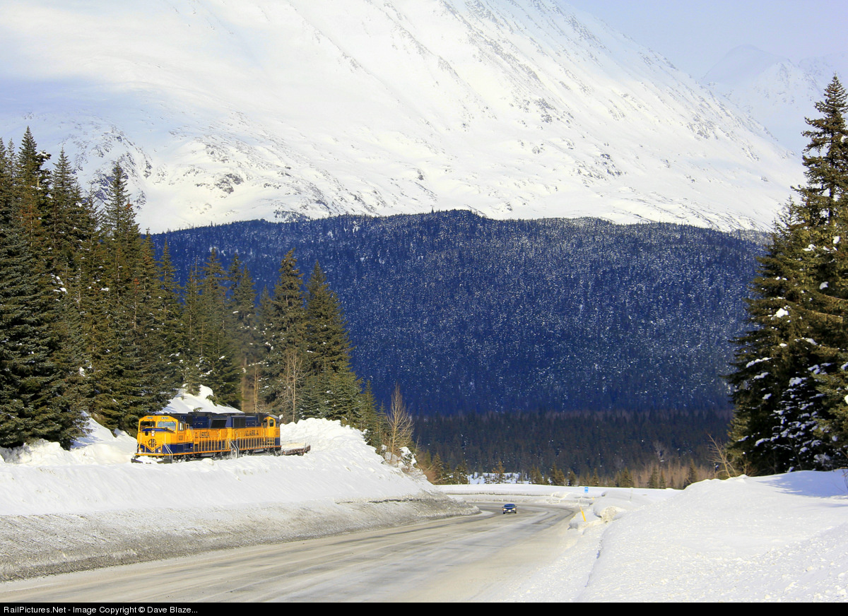 It was a splendid cold Sunday with bluebird skies and crisp white snow abounding. An empty intermodal (bare table) train was called for a date with the Northland Services barge at the ARR's southernmost terminal in Seward. So, a quick call to my friend Frank Keller and we decided to go for it. What a chase...114 miles from Anchorage to the end of the line with not a cloud in site. Two clean SD70s led the train, which albeit was not very photogenic consisting of one tank car and 60 flats (most of which were empty) for a total of 2660 tons and 4852 ft. Here the train is seen marching up the short but steep 2.07% climb to Divide Summit, about to duck under the highway and then drop down the last 10 miles to the docks at Seward. The sheer massiveness of the Kenai Mountains dwarfs the train and the approaching vehicle on the adjacent highway. Ahh…such is the splendor that is ALASKA!