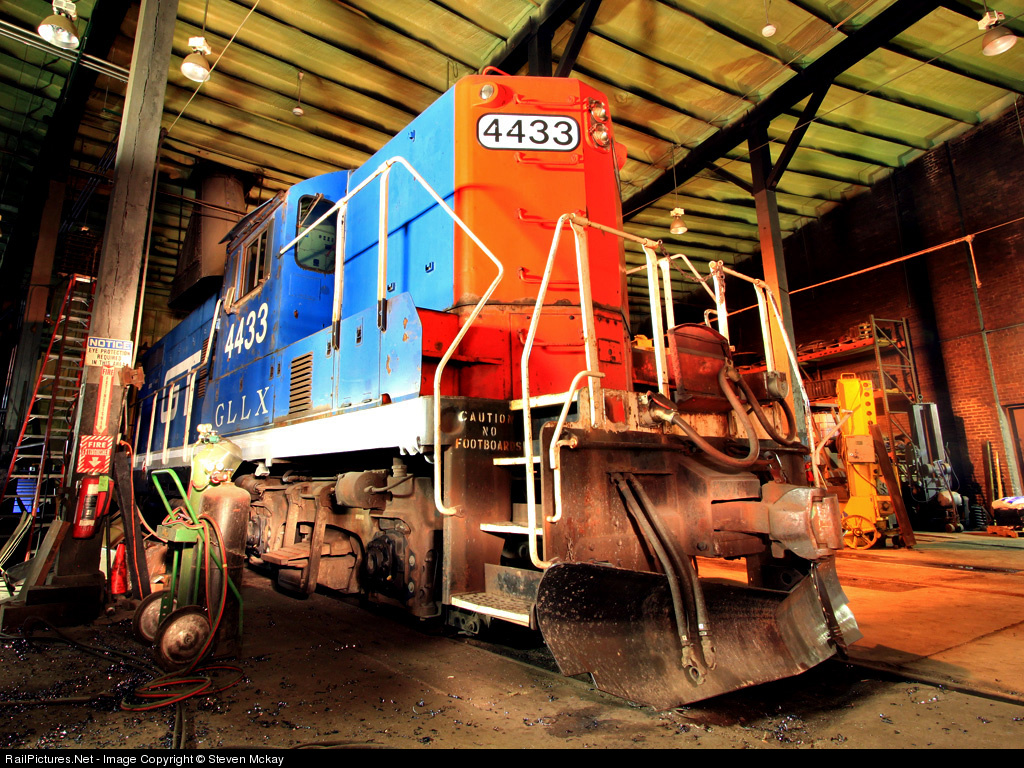 | GLLX 4433, one of two ex-GTW GP9's owned by Great Lakes Locomotive sits in the MQT shops in Manistee Michigan on a cold March night. 4433 is on lease to the MQT and usually works the MAC grain elevator in Newaygo. Ex-GTW high hood engines are a rare find and to find one still earning it's keep on a railroad is even rarer. Not much has changed to this old roundhouse since it was built in the steam era, evidence of this is the smoke exhaust stack above the 4433. Photo taken with Permission. |