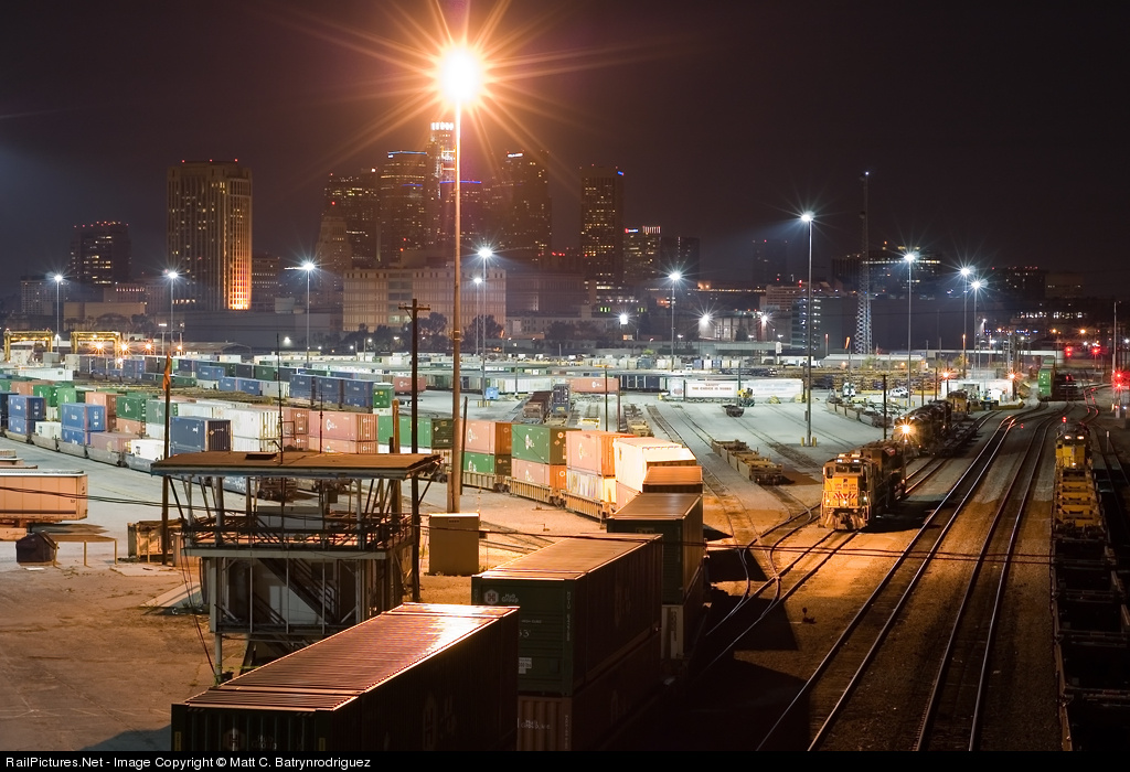 | LATC, the Shops Yard can be a busy place after dark. In the background a stacker passes by on the Metrolink River Sub, while a baretables train lead by two SD40-2s waits for a signal at CP Yuma Jct. A recently arrived stack train is sorting out blocks of cars for unloading while sets of yard and road power idle awaiting their next assignment. |
