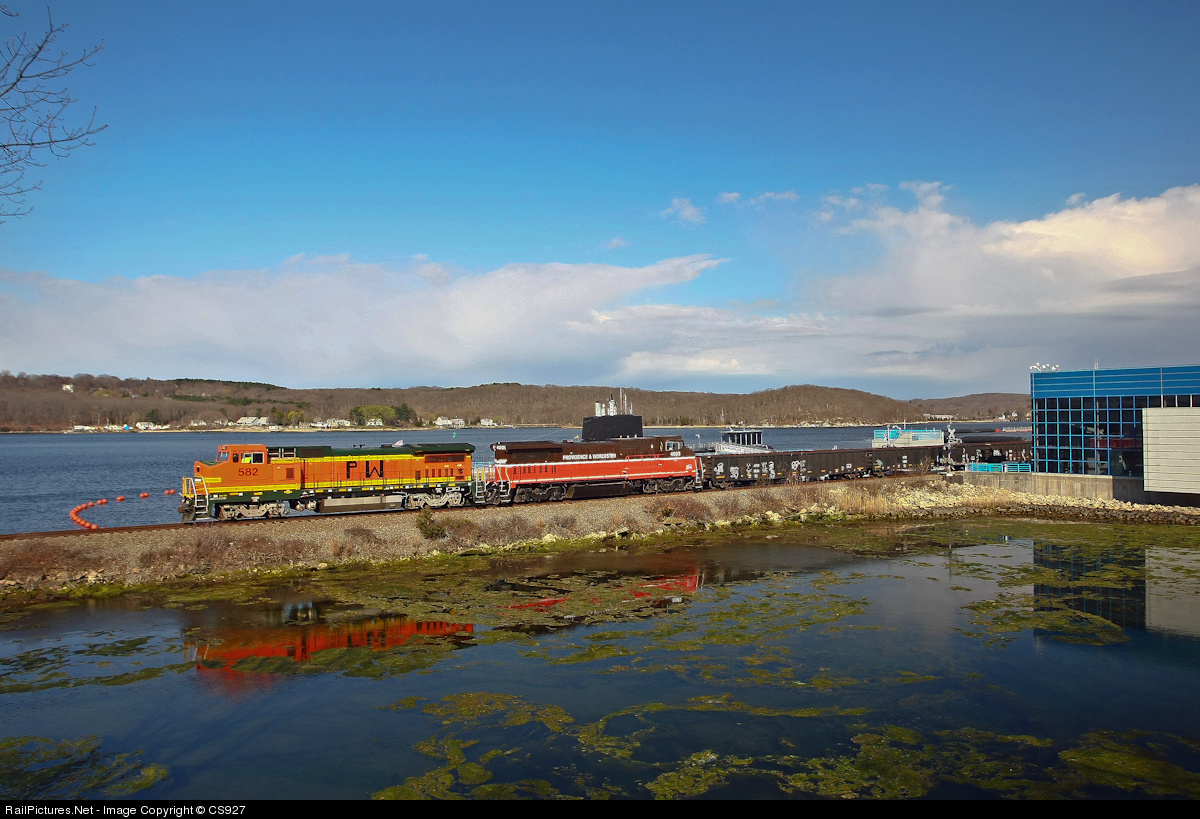 | Providence and Worcester train NR-2 makes its way south past the USS Nautilus in Groton, CT with two ex BNSF widecabs.