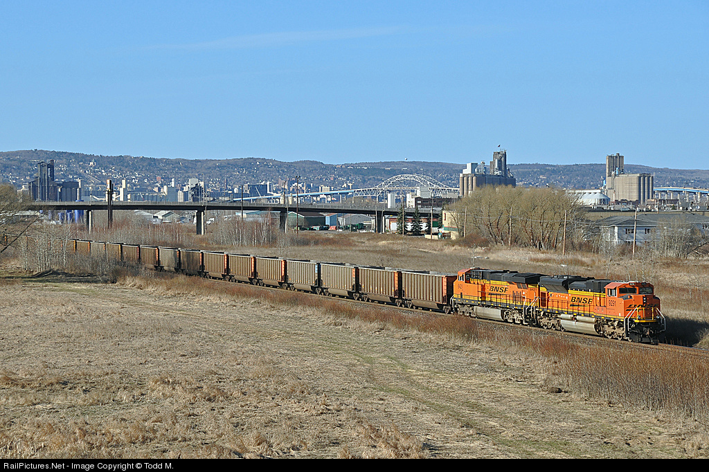 | Coal empties depart Superior and Detroit Edison's Midwest Energy Resources dock headed back for another load of PRB coal. MERC is BNSF's largest single coal destination. The city of Duluth, MN can be seen in the background. |