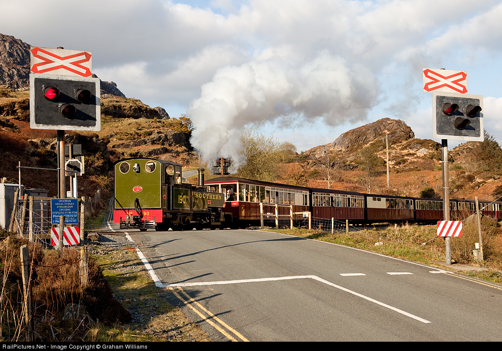 | Britain's newest steam loco, Lyd, built in 2010 crosses the road at Tanygrisiau on the Festiniog Railway on April 1st 2012. |