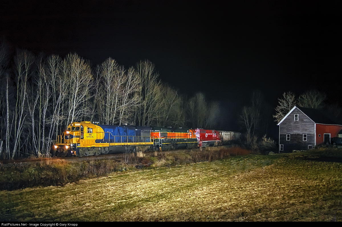 Vermont Rail System power, in the form of GP-40 CLP 3006, makes a rare appearance here working MM&A train 710, trailing a pair of MM&A's ex-BNSF B23-7s at 23:51. Up here in Northern New England, spring is still a ways off, providing a landscape where this colorful trio of engines is accented further at night.