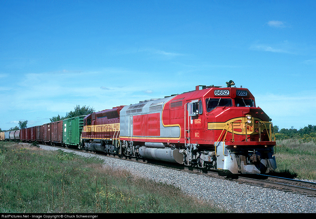 | WC 6652 and 6602 speed around the curve at Rugby Junction with train 46. The 6652 wore an untouched ATSF warbonnet scheme and kept its Santa Fe number for quite awhile when it first came to the WC, it then was given number 6652 and had a tasteful WC stencil on the nose and below the number on the cab. Later after someone reportedly still mistook the unit as a ATSF locomotive it was given this almost Soo "bandit" like scheme with the big SANTA FE on the sides covered in a red square of paint. Thankfully after this it soon was sent in for a full WC scheme. |