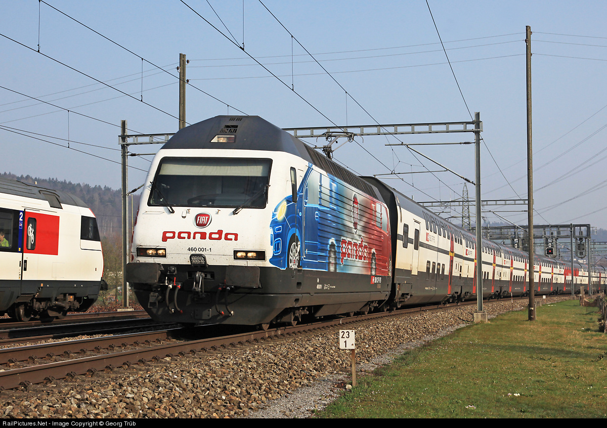 | Newest addition to the Re 460 with special paint scheme is 460 001 "FIAT Panda", pulling Intercity 716 from St.Gallen to Geneva Airport in Winterthur Tössmühle. Meeting with IR 2111 Biel-Konstanz, both trains runing with 125 km per hour. |