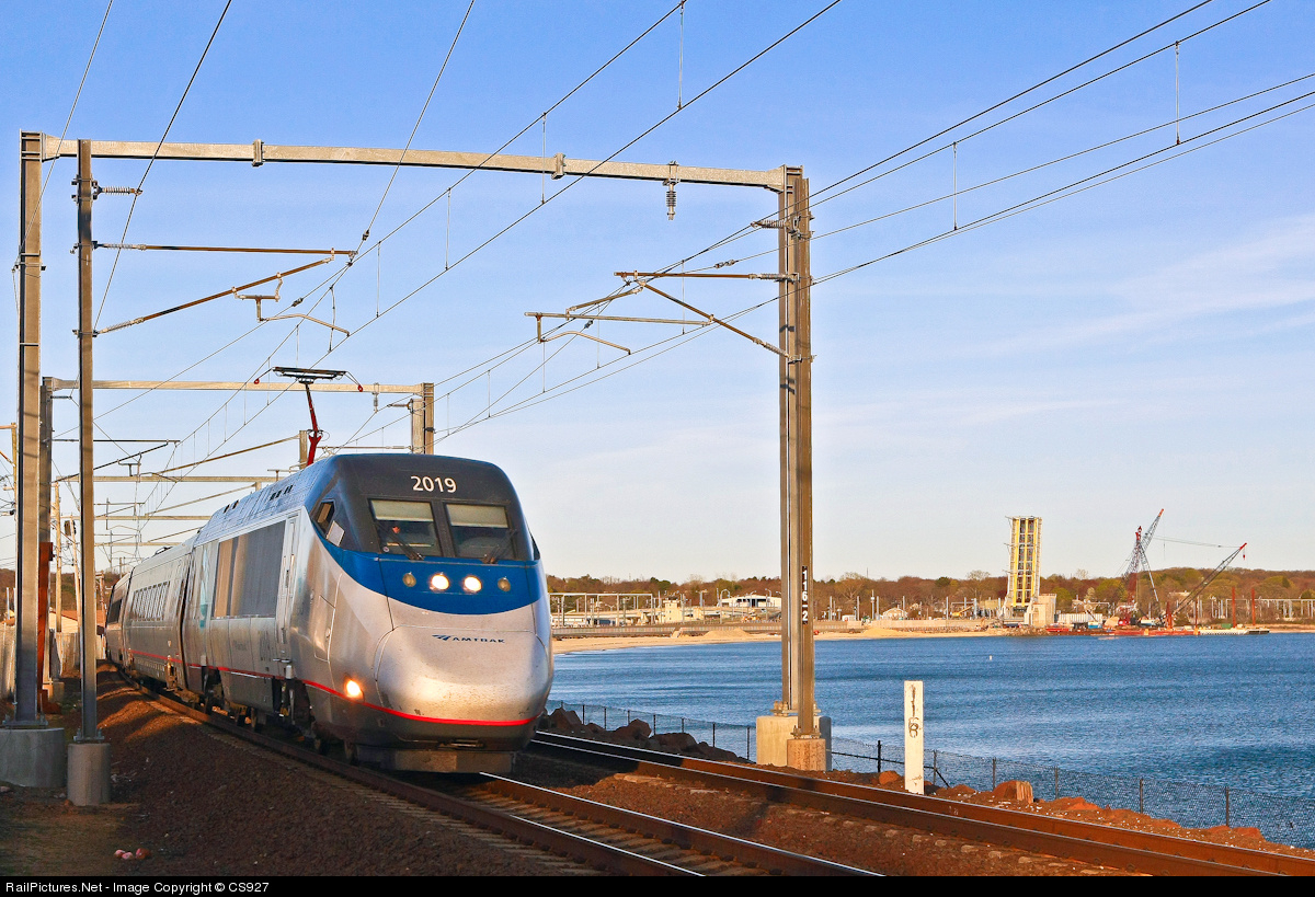 Amtrak Acela Express 2193, enroute to New York and Washington, catches the last rays of sunlight along the bay in Niantic, CT. Looming in the background is the new span for the Niantic River Bridge replacement. Set to open in 2013, the new span will replace the existing one, built in 1907. The replacement of the span will include realigning the right-of-way slightly to the south to provide a smoother approach to the bridge.