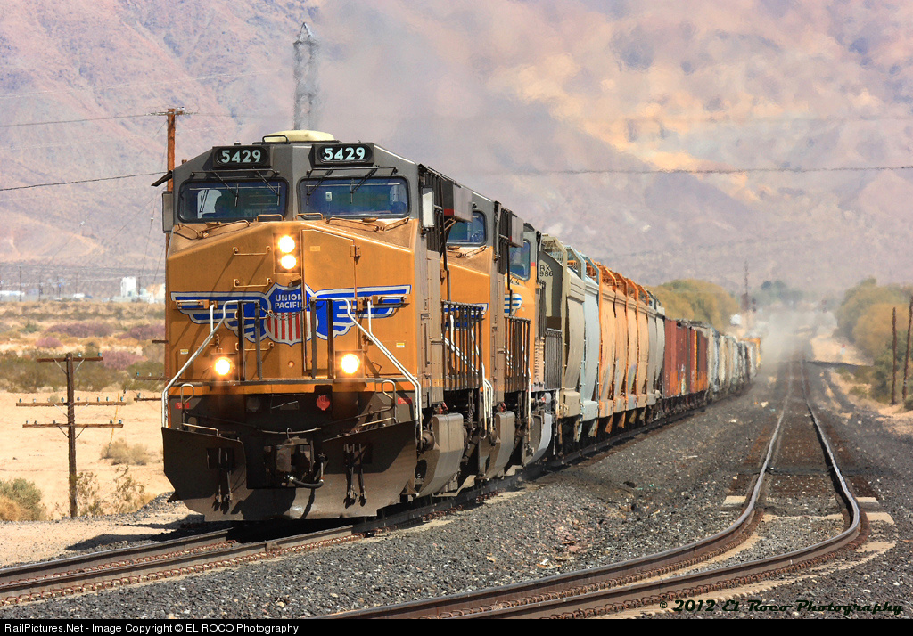 | Meeting the BNSF at Dagget - A manifest train lead by UP 5429 rounds the turn at Dagget where it will roll off the north end of the UP Los Angeles Subdivision and onto BNSF trackage for the trip down the Cajon Pass to the Los Angeles Basin. |