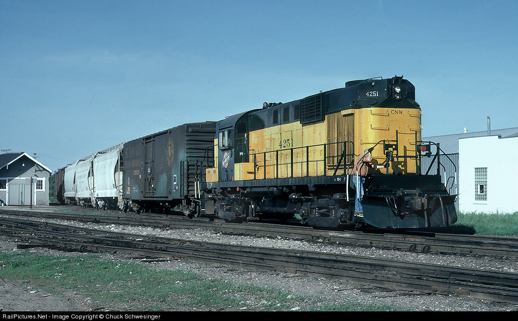 | Not long after transfer from assignment in Huron SD, the 4251 has made a new home in Upper Michigan. The lone CNW RS-11 usually was assigned to the job that worked from Iron Mountain to Powers and return. This shot has the train pulling around the wye in Powers preparing to make a set out that will be picked up by the C628 powered Escanaba-Green Bay freight. After shuffling cars for an hour or so the 4251 will return to Iron Mountain. The 4251 was bought second handed from GE by CNW in 1973, and retired by CNW on August 9, 1983. CNW got a decade of good service out of the elderly Alco and definitely their moneys worth! |