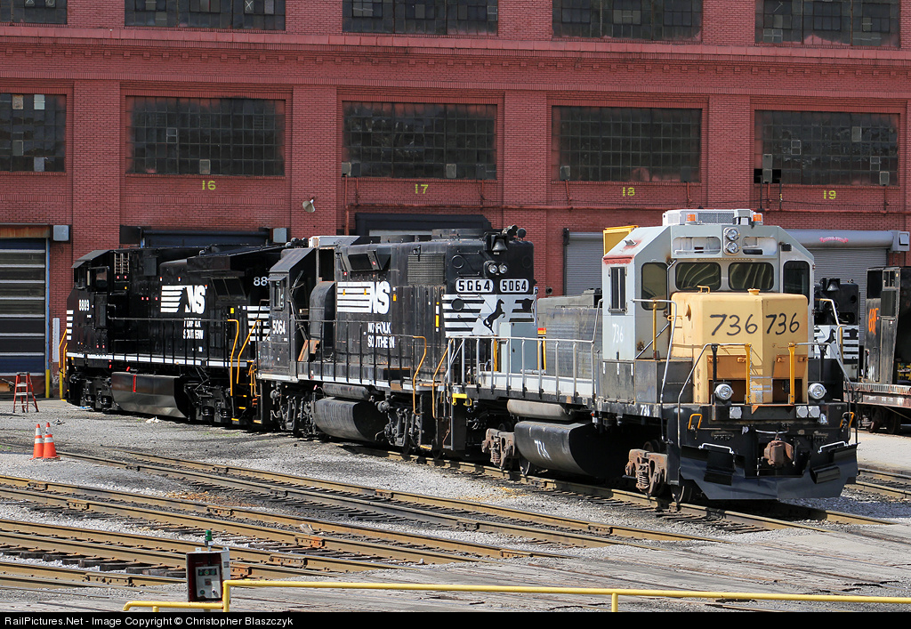 The shell of a soon-to-be-rebuilt NS road slug, RP-E4C 736, sits outside the Juniata Shops. Behind the slug is GP38-2 5064, a high hood unit built for the Southern in August 1973. At the rear is Norfolk Southern's first widecab locomotive, C40-9W 8889 (built Jan. 1996), in a fresh coat of paint, making one wonder if this unit will be part of the festivities for NS's 30th anniversary on June 1, 2012.
