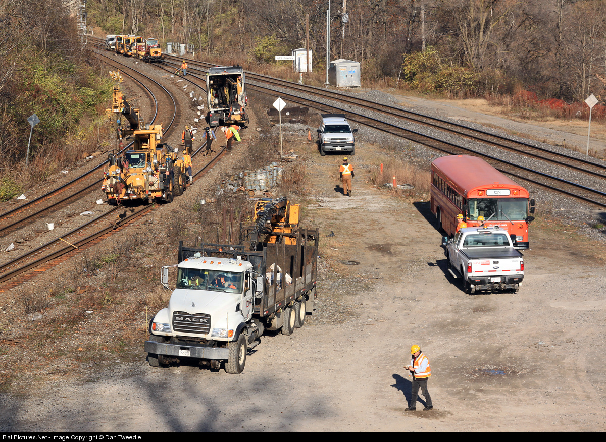 Various MOW equipment, supervisors, and foremen congregate at mile 0 on the Dundas Subdivision, otherwise known as Bayview Junction, to replace track clips on the south track.