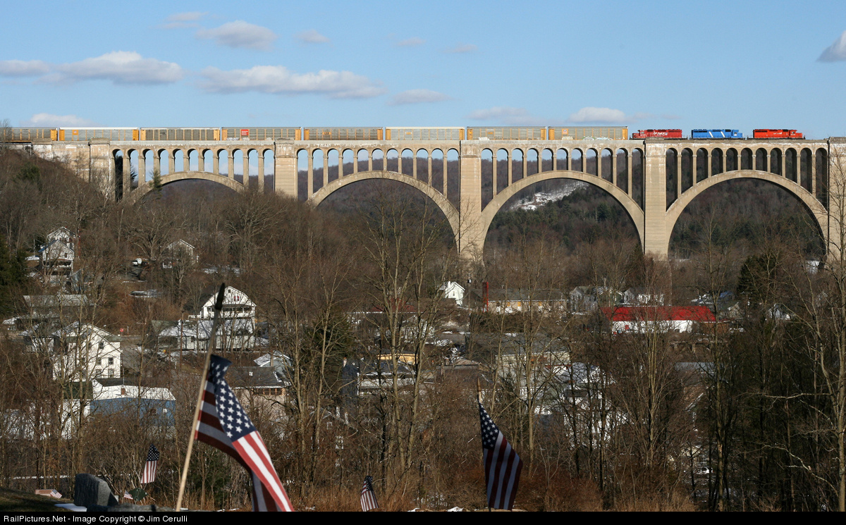 CP train 258-02 with CP 5910, CEFX 3127 and CP 5677 for power sails over the massive Nicholson Viaduct in Nicholson, PA with nearly 100 cars of Autos, Freight and Intermodal for Allentown, PA as American Flags flap in the wind. Nearing its 100th Anniversary, the Nicholson Viaduct still host's 12-15 CP and NS trains per day on the vital North/South CP Sunbury Subdivision.