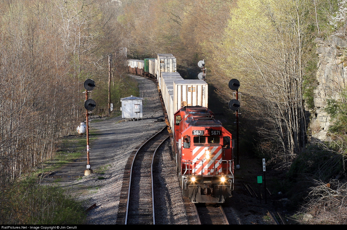 | CP train 550-30 with CP 5671 and CP 5910 in charge heads South through Hop Bottom, PA (CPF 648) on the CP Sunbury Sub with 6000' of Intermodal and Grain for CP's Taylor Yard near Scranton, PA. This train is normally nocturnal however due to Track Work the previous night, the train made a very rare daylight appearance on the CP Sunbury Sub! |
