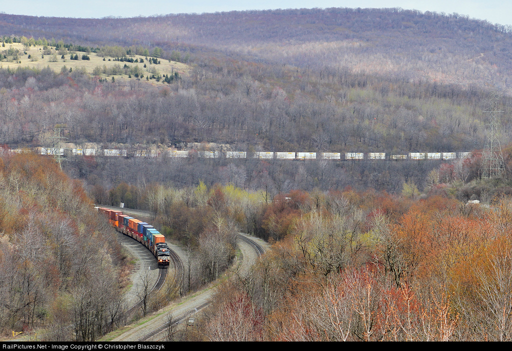 | NS C40-9W 9674 and C40-8W 8431 near the summit of the grade over the Alleghenies as they pass far below the town of Tunnelhill. Their train can be seen snaking along the hillside in the distance through the blooming spring foliage, looking almost fall-like in color. |