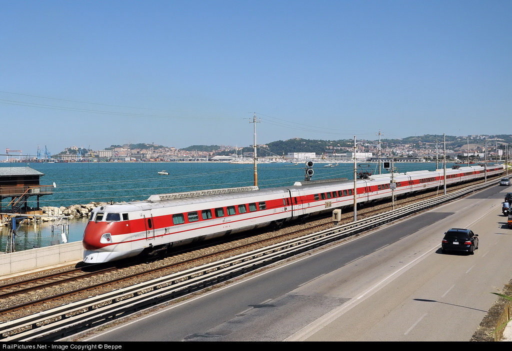 | One of the few examples of the old "pendolino" work in Ancona, the railway runs along the Adriatic Sea, in the background you can see the harbor. |