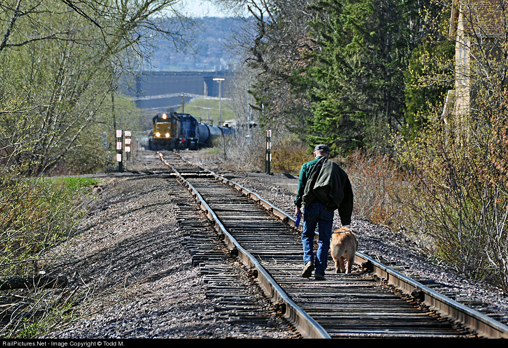 | A man and his dog take a leisurely walk down the tracks on a nice spring afternoon while in the distance the U.P. local switches a small yard on Superior's east side of town. |