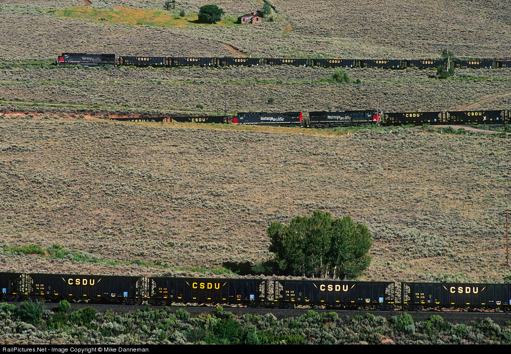 A SP CSUX coal empty climbs through the double loops at Crater, Colorado. Common on SP’s newly operating DPU-equipped trains at the time, a lone No. 298 is on the head end, while the mid-train DPUs follow below. Two more SP AC4400CWs will climb through the loops too, pushing hard on the rear of the train.