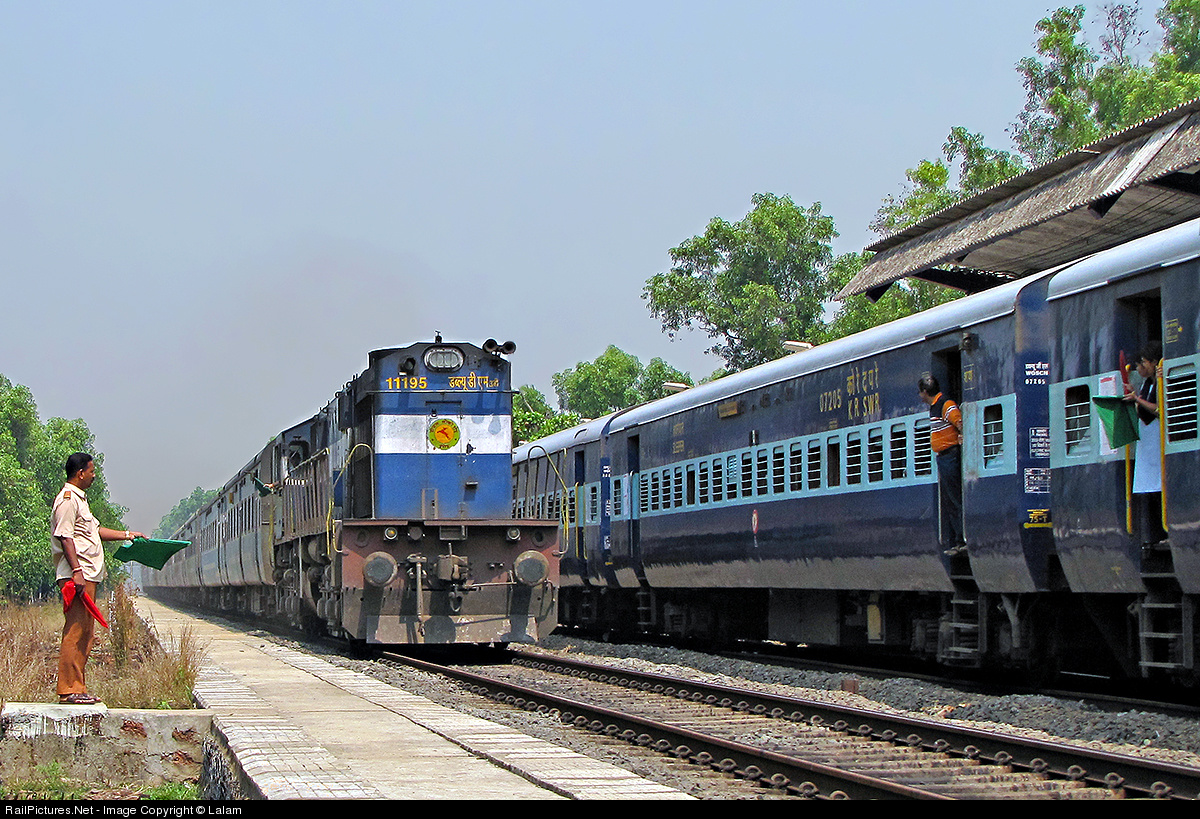 On a single line section with bi-directional movement, one train is made to stop at a station to give way or crossing of another train. In this photo, Mumbai bound Mandovi express is making its scheduled halt at a small station named Sindhudurg while Mumbai-Madgaon superfast Janashatabdi express is crossing with high speed. Station staff can be seen on both sides, exchanging green flags with the train crew to convey "all clear" message.