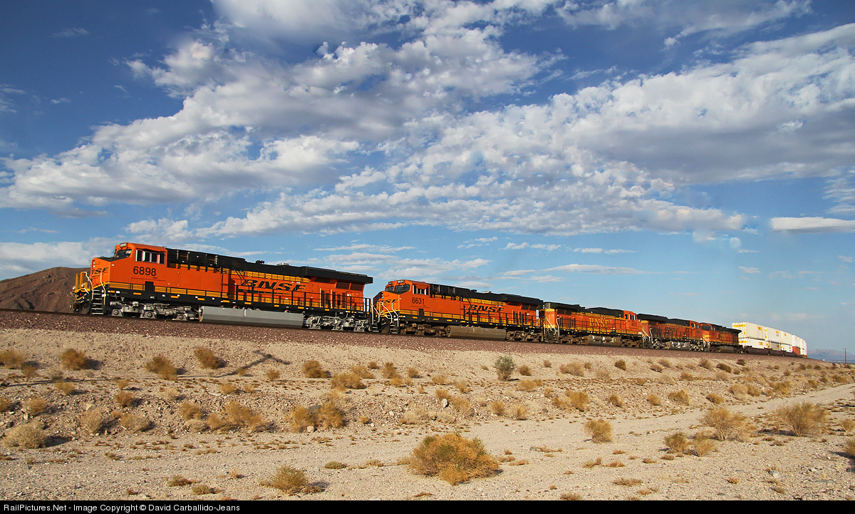 | A new 6800 series ES44C4 is on the point of a Kansas City, KS to San Bernardino, CA hot intermodal train as it moves at snail speed over the hills of the Mojave Desert. |