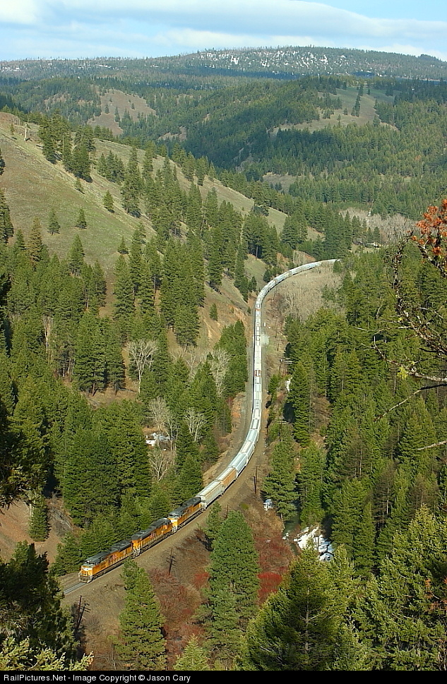 Soda Ash from Green River to Portland must conquer a major obstacle on its journey to export, the Blue Mountains. Here in Pelican Canyon the grade reaches 2.21%, and this Soda Ash load has all traction motors whining and wheel slip screaming as it struggles for the Summit... The Blues are a remote and fantastic place to visit....