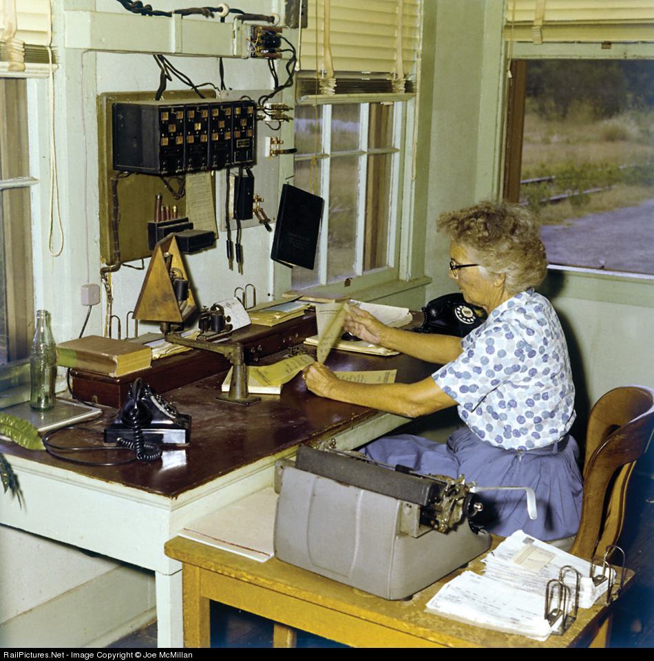 Mrs. Olivia W. Pennington, station agent for the T&NO (SP), goes about her chores at Yorktown. She is looking over some train orders, which were rarely issued at Yorktown. Her husband was also a T&NO agent and he served at Poth, Texas. The Yorktown station was closed in November 1967 and torn down in 1999.