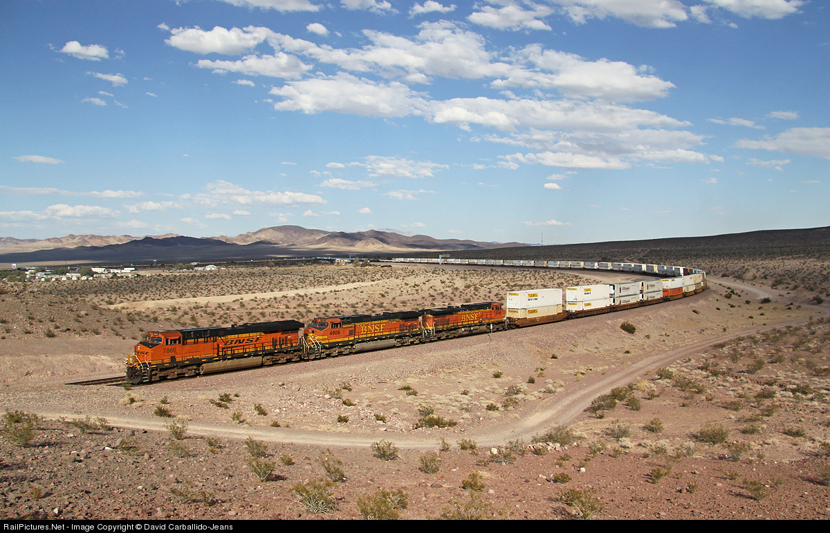 | This is what a typical day in the town of Ludlow looks like. With high clouds covering the blue sky for miles and miles and the signature desert mountain in the background. But what makes the shot is the BNSF 7866 with its hot Willow Springs, IL to Stockton, CA intermodal west as the crew will take this train to Bakersfield. |