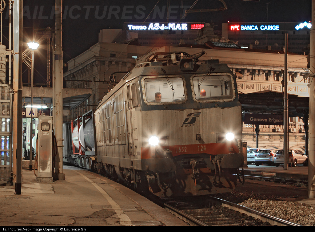 | E.652 124, waits for the signal at Genova Brignole whiilst working a container train, 24 April 2012. |