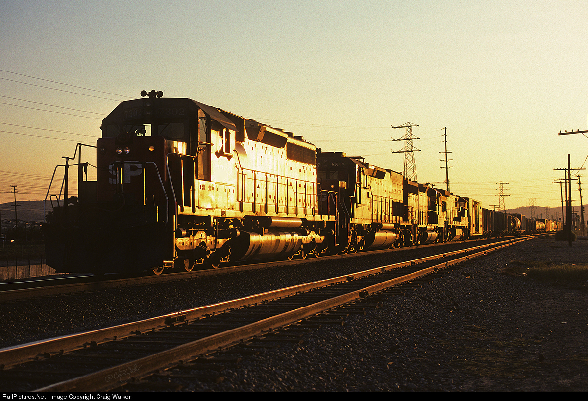 The setting sun glints off the power on a Southern Pacific eastbound at Walnut, California, on October 18th, 1980. Power for this train is SD40R 7302 (ex-SD40 8422), SD40T-2 8517, GP40-2 7616 and U33C 8701 - The wide variety of power such as this on one train is what made the "Espee" such a favorite with railfans.
