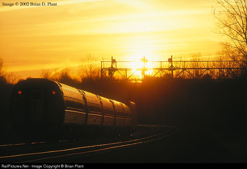 | An Amtrak passenger train heads west into the setting sun roughly halfway between Rochester and Syracuse, New York. |