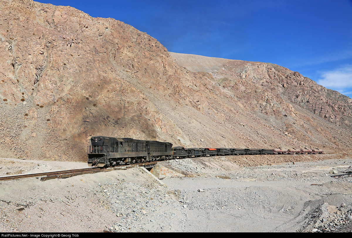 | The narrow valley is filled with donner and smoke of the worn out GR12 # 93 and 412 of the Ferronor train from Llanta up to Potrerillos. |