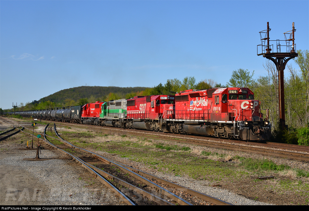 Canadian Pacific Railway continues to put on a colorful show on ethanol trains bound for Albany, NY (among other destinations). The latest EMD consist included CP SD40-2 5916 (dual flags), SOO SD60 6051, CITX SD40-2 3059, and SOO SD60 6254, is splitting the old D&H signal masts at Whitehall, NY. Be sure to check out more photos at http://steelwheelsphotography.com