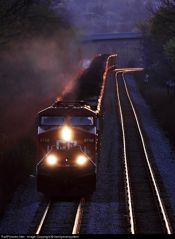 Cleared Up- The absolute signal in front of this loaded coke train, has just cleared up. The engineer has gone to the corner with his throttle, and his power responds, with a cadence of all the noise and exhaust this CP AC44/SD40-2 duo can muster, in fading light.