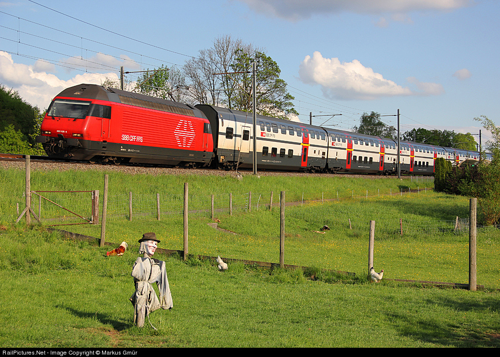 | Straw man, hen and train: Intercity from St. Gallen to Zürich near Bassersdorf in the eveningsun |