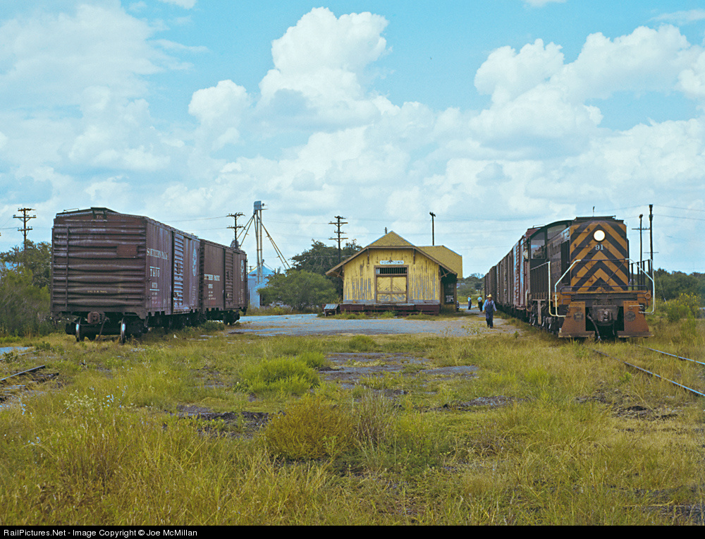 | A large South Texas coastal cloud temporarily darkens the scene slightly as T&NO (SP) local train 377 stops at the station in Yorktown. The conductor is walking toward the head end as other crewmen scope out the switching to be done. Trains 377 and 378 operated between Yoakum and Kenedy, Texas. The branch between Cuero and Kenedy, including Yorktown, was abandoned in stages between 1964 and 1972. |