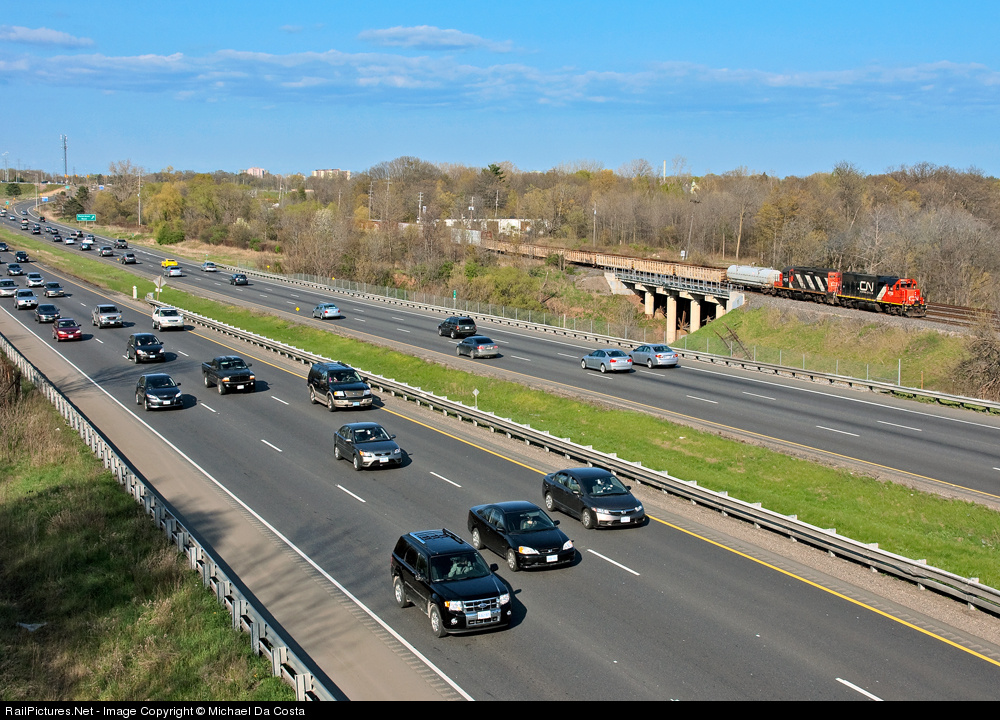 Drivers along the 403 go on about their daily routine in the afternoon rush hour, a pair of GP's drag out CN 435's set off to sort out in the lower yard.