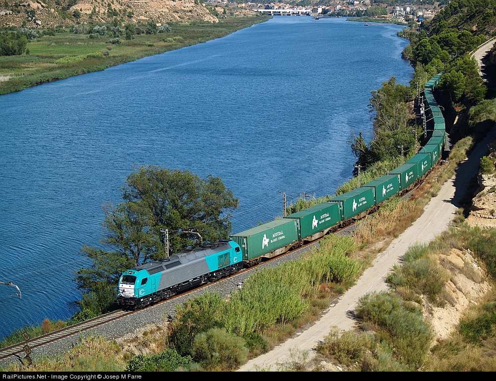 | Like a green snake, this private container train is bordering the Flix reservoir on its way to Zaragoza and Madrid. |