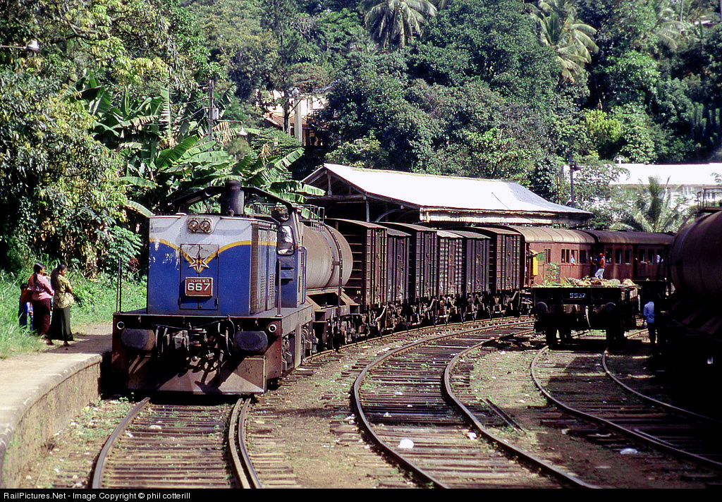 Mixed trains are still a feature of Sri Lanka Railways. Here 667 arrives at Peradeniya Junction, near kandy, with the 1020 kandy to Nawalapitya, mixed. Passengers ride in ancient looking carriages at the rear of the train. 667 is a 1969 built Henschel, diesel hydraulic, W3 class.