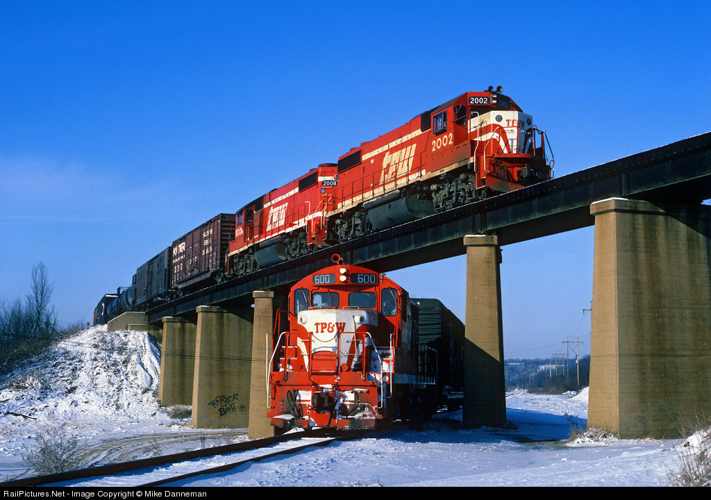 Two Toledo, Peoria and Western trains pause at the Farmdale trestle near East Peoria, Illinois. Above is the the Effner Local with GP38-2s Nos. 2002 and 2008, passing over the Morton Switcher with GP18 No. 600. This photo was arranged by McMillan Publications with the cooperation of TP&W for the Joe McMillan and Robert P. Olmsted book “The Peoria Way” featuring the railroad. This scene was only possible for 54 days at the end of the TP&W before the merger with Santa Fe at the end of 1983. Recently acquired trackage rights on the lower line via the Norfolk and Western used to reach Morton made the shot possible.