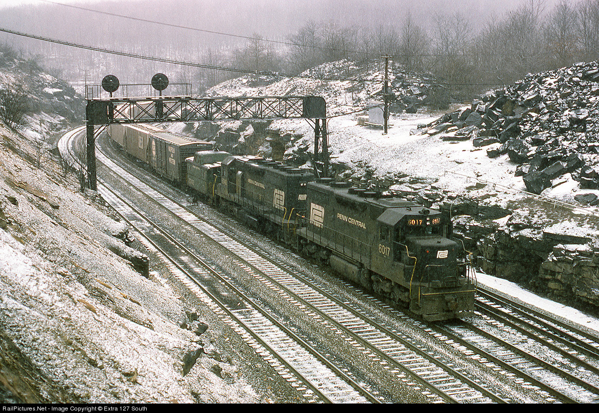 | A helper set was providing a bit of retardation on an eastbound unit grain train as it dropped downgrade through Benny Interlocking in Bennington, PA on Jan. 12, 1975. Looking back, the practice of running a boxcar between the train and the caboose on coal and grain trains was employed by several railroads then. |