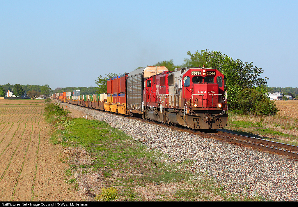 | A lengthy 25T is stretched out through the rolling farmlands of northern Ohio behind a pair of Soo Line SD60's. Soon the crops will be growing tall in the fertile fields near Alvordton. |