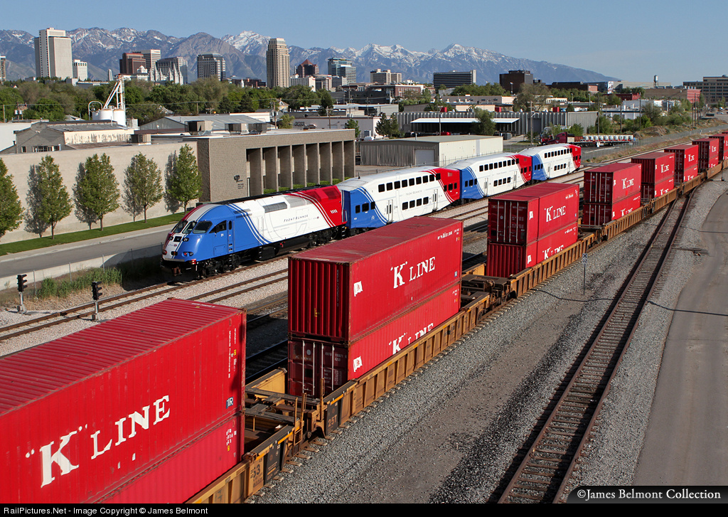 On National Train Day 2012, an inbound UTA FrontRunner commute meets a colorful KG2LB stack train at the 6th North overpass in Salt Lake City.