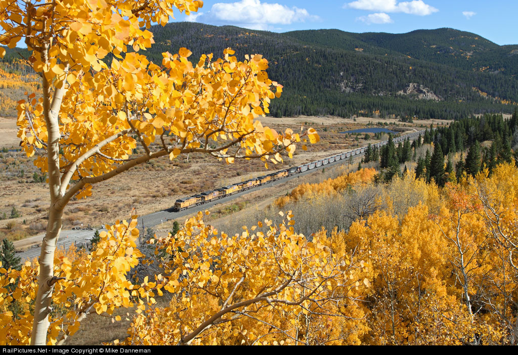 A westbound UP coal empty passes through Tolland, Colorado, on the climb to the Moffat Tunnel, amid the color of autumn.