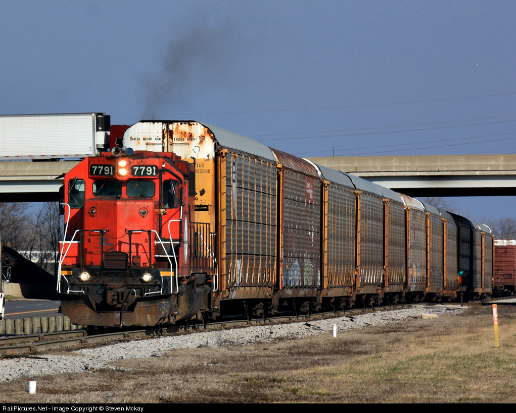 7791 drags a cut of empty racks out of the yard to be spotted at the loading ramps at Jeep.