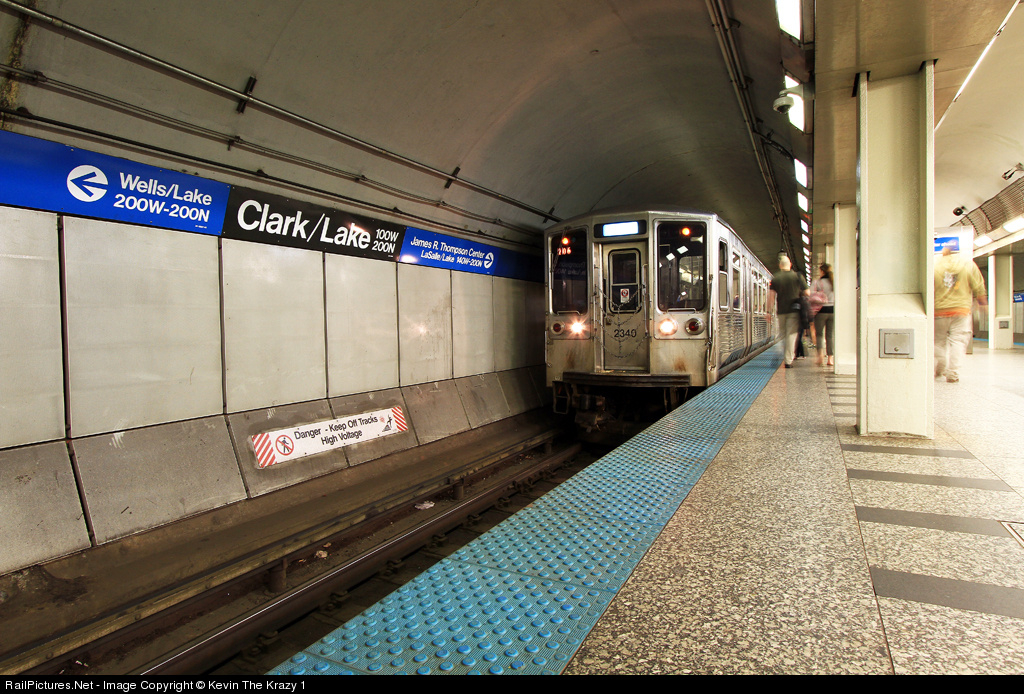 Budd Co. car #2340 makes its stop at Clark & Lake on its way to Ohare. 4 car trains on the blue line are common over the weekend as normal 8 car operations run "belly" style during the week.