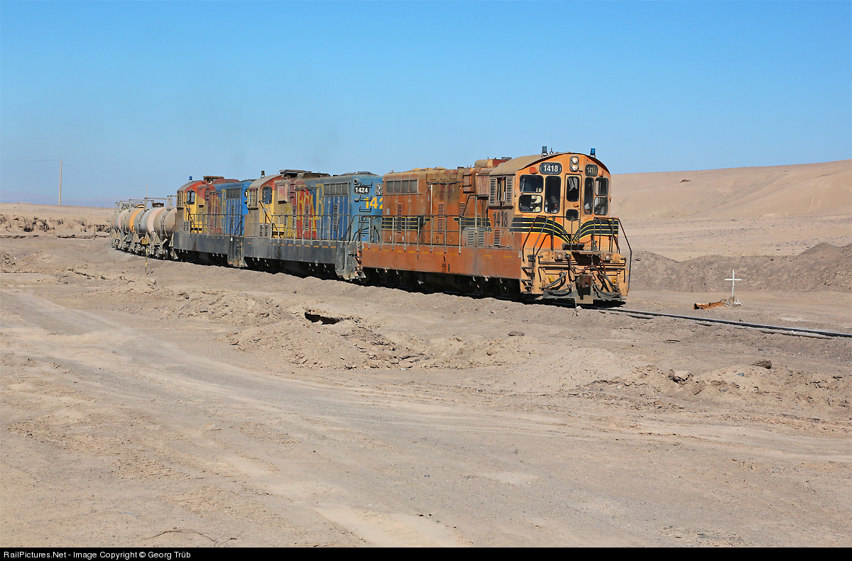 Three "Canadians" NF 210 # 1418, 1424 and 1430, the first still in the former orange FCAB paint scheme, are pulling a tank car train north of Baquedano towards Calama. The locomotives were built by GMD for Canadian National Railways Newfoundland cape gauge lines in 1956/1960 and came to Chile between 1988 and 1994 (some via the Ferrocarril del Pacifico FCP in Nicaragua). # 1418 was the first in service for FCAB since may 1992. Now 18 of this type are running on 1 meter gauge for the FCAB, mainly between Antofagasta/Mejillones and Chuquicamata. Instead of their outside look, they are very similar to the GR12's of the FCAB.