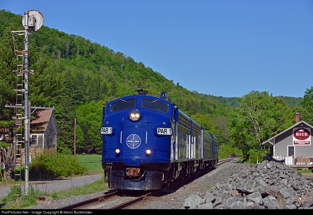 Pan Am's Mechanicville, NY to Ayer, MA office car special (OCS) train heads eastbound through Charlemont, MA with the PAR-1 and PAR-2 twin FP9As leading the ST 100 and ST 101 office cars. For more pictures, please visit http://steelwheelsphotography.com