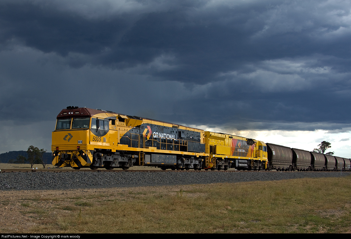5005 a C40ACi wearing the old QR National livery with new logo 's leads 5021 a C44ACHi wearing the new livery east bound with a loaded coal train past Wilpingjong loop as the storm clouds start dropping rain over Wilpingjong Coal's mine.