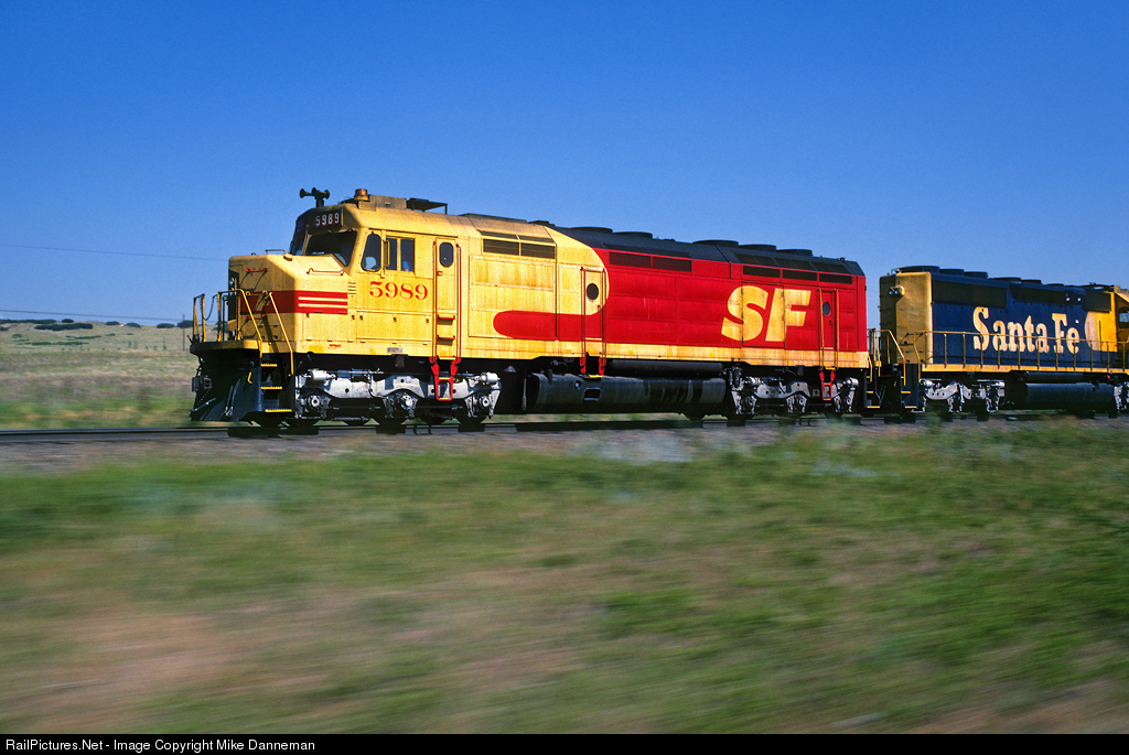 Pacing the Q Train Santa Fe’s Q-train south out of Big Lift (Denver), Colorado hums down the Joint Line, south of Castle Rock, Colorado, on July 10, 1989. Cowl F45 No. 5989 leads the train, and is painted in a scheme for the proposed merger that never happened between Southern Pacific and Santa Fe. Some say that the future letters that were to emblazon the sides of the ill-fated SPSF stood for “Shouldn’t Paint So Fast” since many locomotives, mostly Santa Fe, were repainted before the merger was approved. The scheme was frequently nicknamed “Kodachrome” for it’s resemblance to the colors of a famous slide film box. Yes, fittingly this image is on Kodachrome 64 . . .