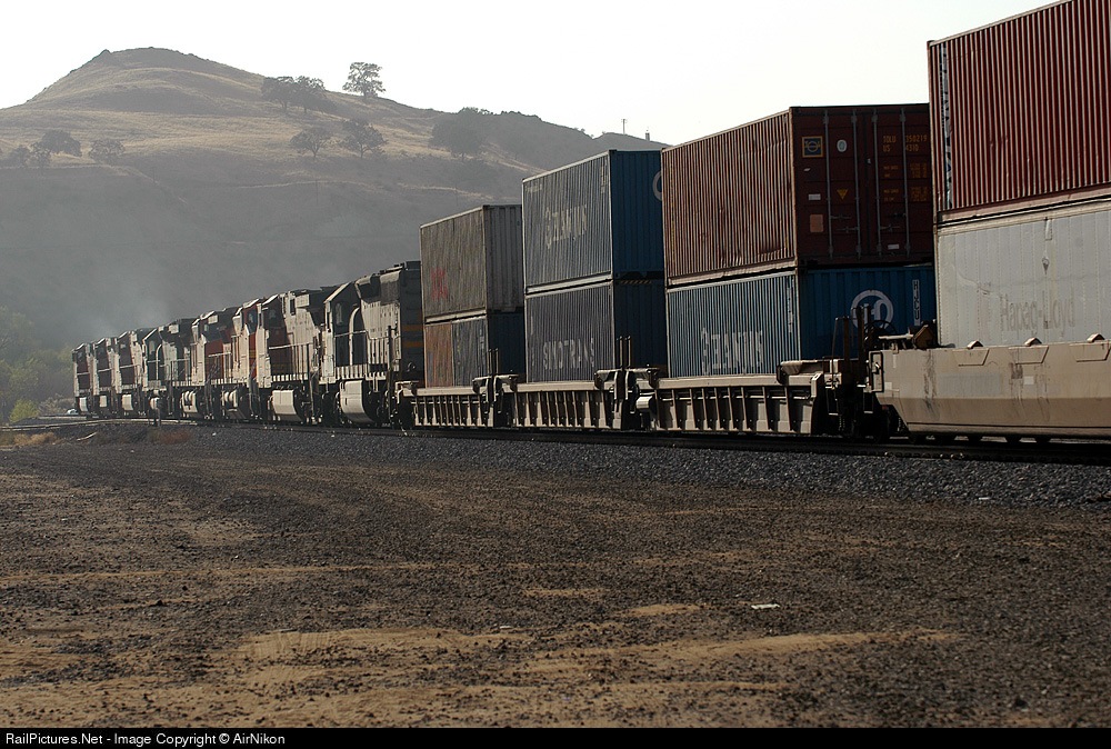 Eight locos hauling a long double-stacker NB just as the sun was setting.