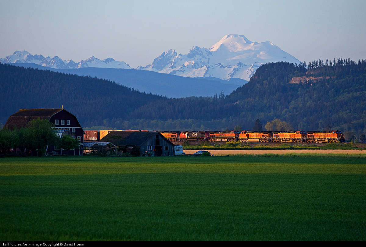 In the last minutes of light on National Train Day, a southbound BNSF freight rolls past the healthy crops -- and not-so-healthy barn -- of a Skagit Valley farm. Looming in the distance is the 10,781' (or 10,778', depending on which Wikipedia page you read) glacier-covered Mount Baker, the highest peak in the North Cascades.